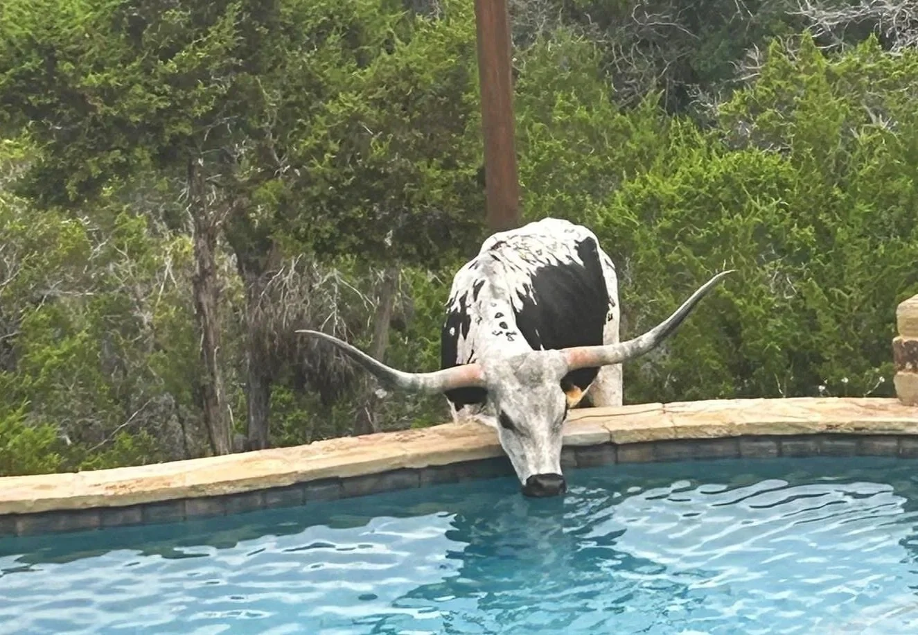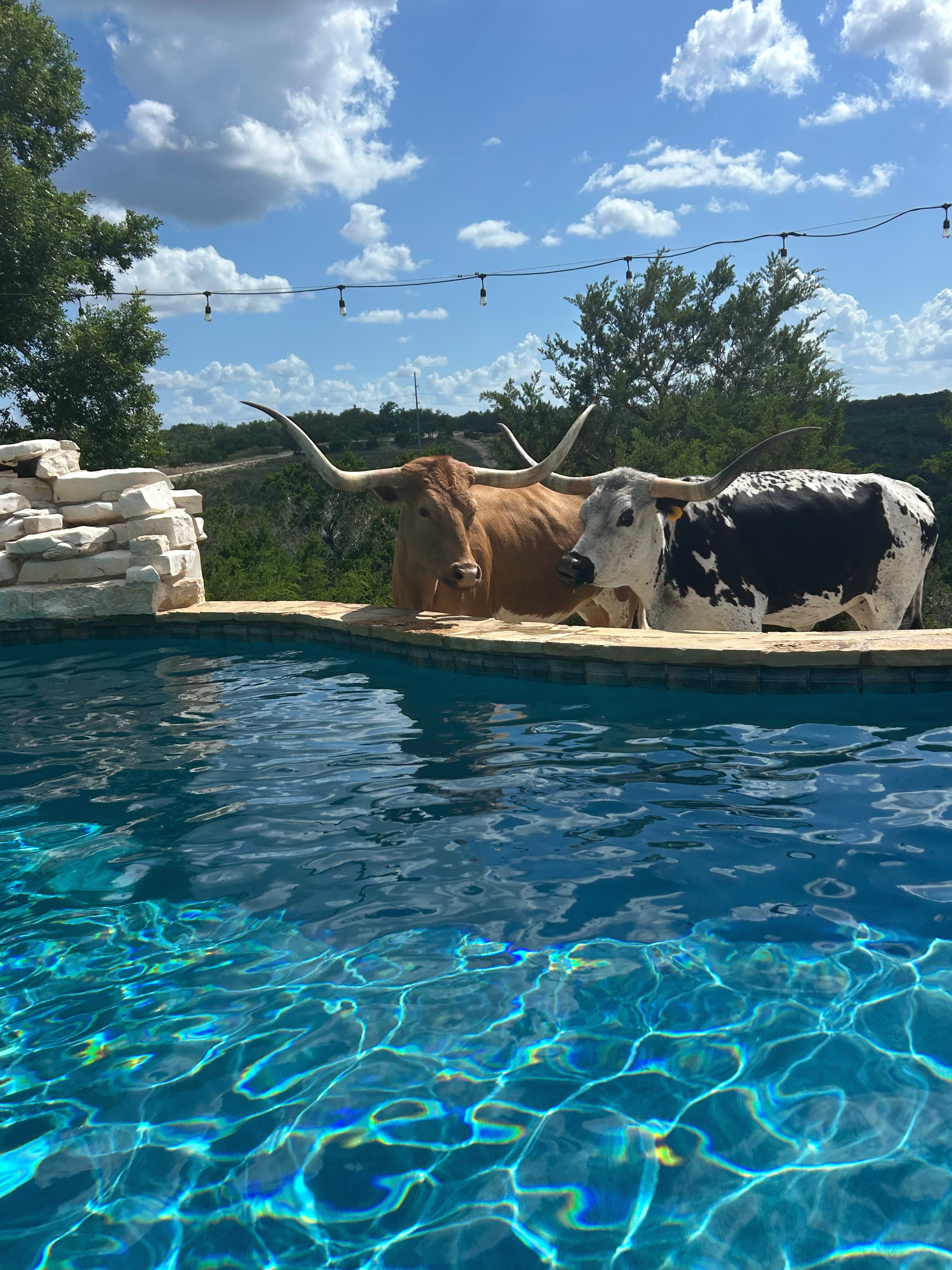 Dive into a one-of-a-kind Texas experience at Triple H Ranch, Swimming with Longhorns. Imagine relaxing in a pool perched above the rolling beauty of the Texas Hill County, where endless panoramic views stretch across the sunlit hills and wide-open skies. Now add a truly unforgettable twist, two longhorns strolling right up to the pool’s edge to meet you.
